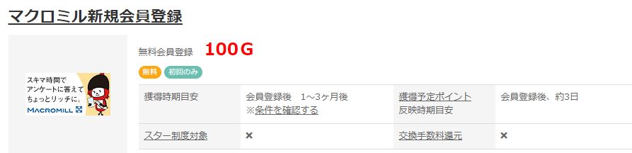 Gポイント経由でマクロミルに無料登録で100円分もらえます。