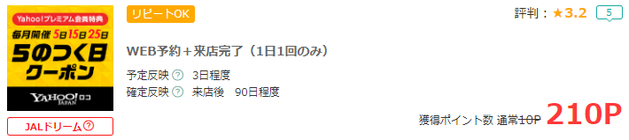 モッピー経由でYahoo!ロコ予約で210pt(210円)ゲット