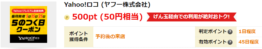げん玉経由でYahoo!ロコを予約すると60円分もらえます。